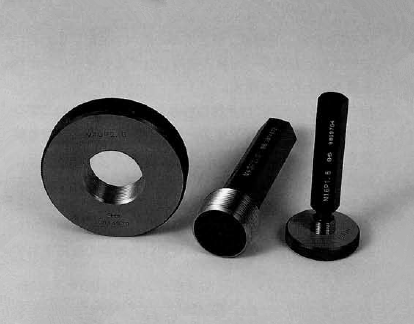 标准螺纹量规由一组相互精密配合的螺纹环规和螺纹塞规组成,此外 被制作成接近于螺纹的基准尺寸,这种量规主要在直接于产品的螺纹镶 嵌中使用。定期检查的时候是和塞规镶嵌为一对,能够检查螺纹环规的 磨损程度。和产品螺纹的全长,轻松地拧进到极限的时候是松弛的而不 是紧嵌合的话,说明被制作的螺纹就是粗糙的、不合格的。另外,量规 的磨损严重的话,即使与量规完 全吻合的螺丝与螺帽也会出现咬不紧的 情况,请充分注意量规的管理。